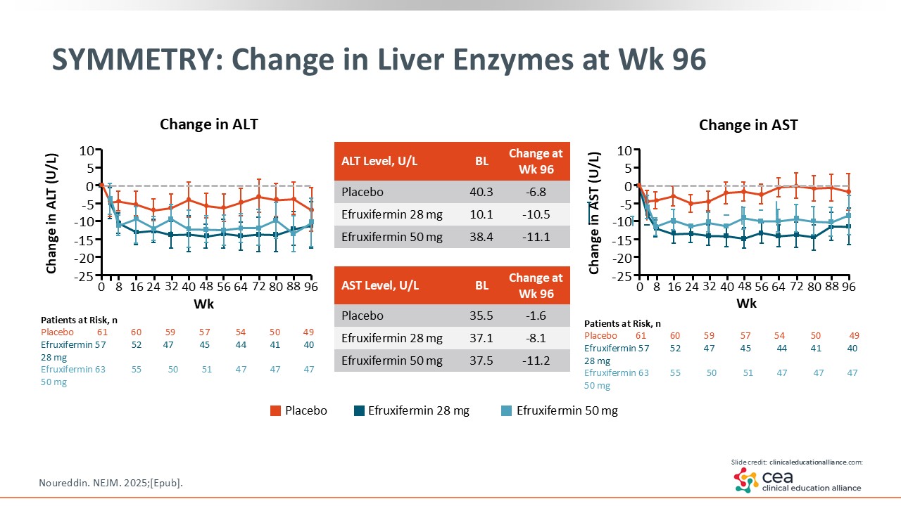 To increase confidence in efruxifermin, SYMMETRY also looked at changes in biomarkers (ie, liver enzymes, fibrosis) with noninvasive testing. As shown on this slide, efruxifermin improved liver enzymes at Week 96.24