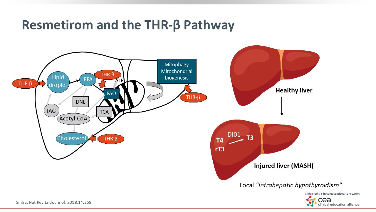 As mentioned, resmetirom was approved in conjunction with diet and exercise to treat adults with noncirrhotic MASH with F2/F3 fibrosis. It is a THR-β agonist, and targets the thyroid receptors within the liver. It regulates lipid metabolism like de novo lipogenesis, synthesis of fat in the liver, and mitochondrial biogenesis, where it increases β-fatty oxidation.12,17