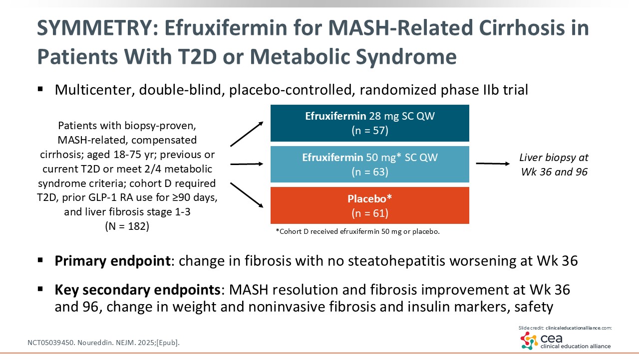 Efruxifermin was also evaluated in a study called SYMMETRY, which enrolled patients with MASH-related, compensated cirrhosis and T2D or who met 2 of 4 metabolic syndrome criteria. This was a multicenter, double-blinded, placebo-controlled randomized phase IIb trial. Liver biopsy was performed at baseline, Week 36, and Week 96. Efruxifermin 28 and 50 mg were compared with placebo.24