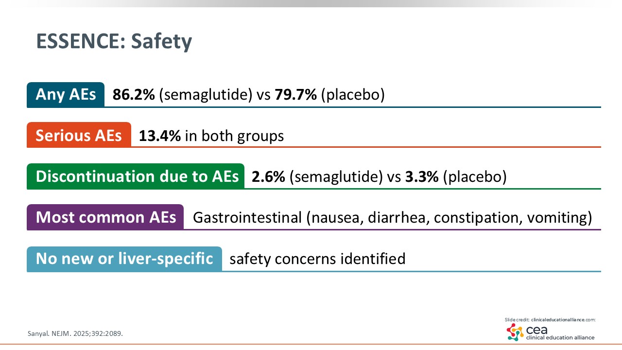 In terms of safety, the ESSENCE trial reported adverse events (AEs) in 86% of patients in the semaglutide arm compared with 80% in the placebo arm. Serious AEs in both groups were reported in 13% of patients. Discontinuation rates because of AEs were low, and the most common AEs were gastrointestinal-related: nausea, diarrhea, and constipation. There were no new safety concerns identified.15