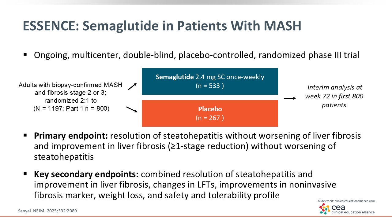 Now let us look at an important study that was recently published. The phase III ESSENCE trial evaluated semaglutide 2.4 mg weekly vs placebo. The trial enrolled patients with MASH and fibrosis stage 2 or 3. They were randomized 2:1, with 533 patients in the semaglutide arm and 267 patients in the placebo arm. The interim analysis that was published evaluated the first in 800 patients at 72 weeks of treatment.15