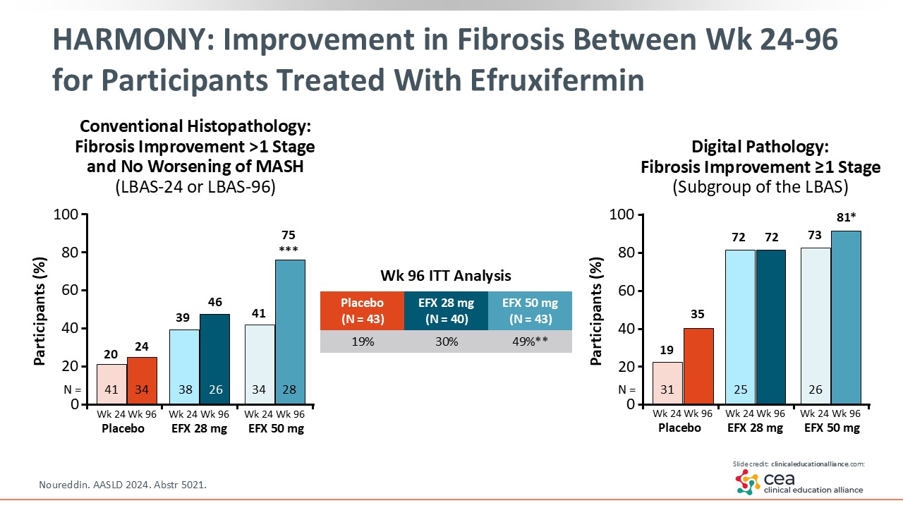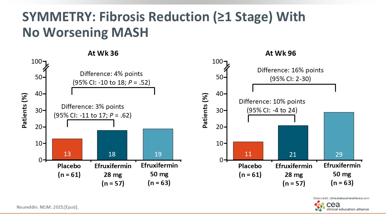 In looking at the results, efruxifermin did not reach statistical significance in fibrosis improvement at Week 36 compared with placebo. However, at Week 96, efruxifermin 50 mg reached statistical significance for improving fibrosis by at least 1 stage vs placebo.24 This is the first time I have seen that benefit in patients with cirrhosis.