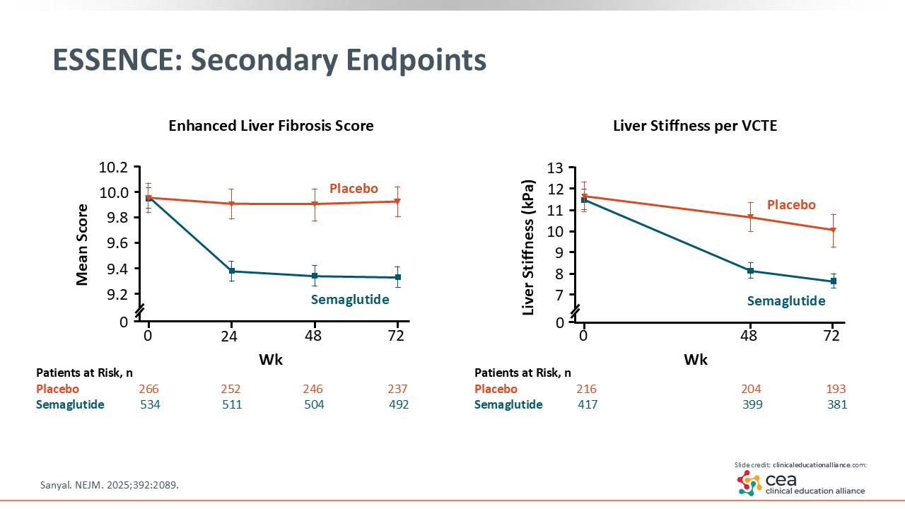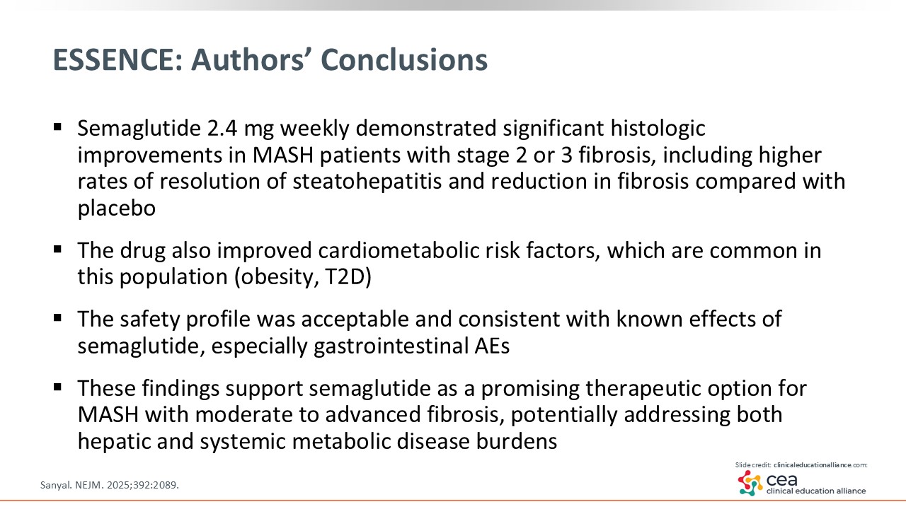 In conclusion, the ESSENCE trial found that semaglutide 2.4 mg weekly demonstrated significant histologic improvement in both MASH resolution and fibrosis improvement in patients with MASH and F2 and F3 fibrosis (also known as those with at-risk MASH). Semaglutide also improved cardiometabolic risk factors common in patients with MASH including obesity and T2D. The safety profile was acceptable and consistent with previous reports. These findings support semaglutide as a promising therapeutic option for patients with MASH and moderate to advanced fibrosis.15