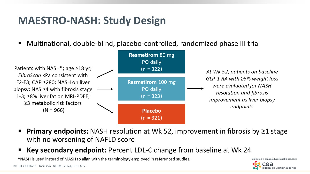 Resmetirom was studied in the phase III MAESTRO-NASH trial, where researchers compared resmetirom 80-100 mg with placebo treatment for 52 weeks. The trial enrolled patients with MASH (seen as “NASH” on this slide per previous nomenclature) and stage 1-3 fibrosis. The primary endpoints were MASH resolution and fibrosis improvement by one stage or more.18