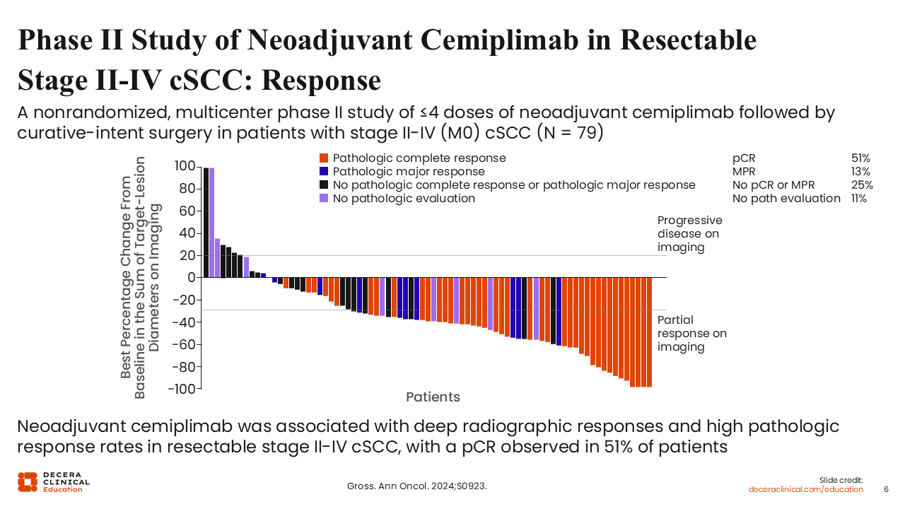 In the phase II multicenter study, neoadjuvant cemiplimab demonstrated substantial activity in patients with resectable stage II-IV cSCC. The primary analysis showed that 50.6% of patients achieved a pCR, defined as no viable tumor cells in the surgical specimen, and an additional 12.7% achieved an MPR, defined as ≤10% viable tumor. Collectively, nearly two thirds (63.3%) of patients experienced 1 of these deep pathologic responses.14