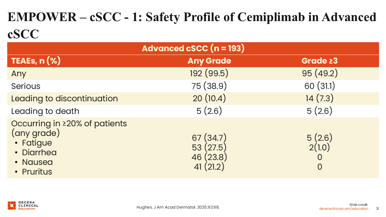 Although neoadjuvant and adjuvant strategies represent the new frontier in resectable disease, our understanding of the long-term safety and durability of PD-1 inhibition is rooted in the pivotal trials for advanced cSCC. Shifting our focus to the final analysis of the EMPOWER-cSCC-1 study, we see that cemiplimab maintains a well-characterized safety profile over multi-year follow-up in patients with metastatic or locally advanced disease. In this foundational setting, cemiplimab continued to demonstrate durable antitumor responses in roughly half of the patient population, with toxicities that remained consistent with the established PD-1 inhibitor class. Most TEAEs were generally low-grade—including fatigue, diarrhea, nausea, and rash—with only a small minority of patients necessitating treatment discontinuation.33