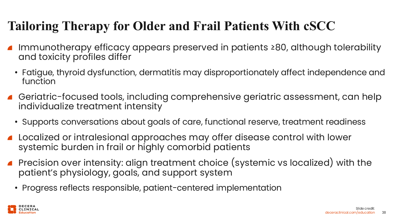 Interest in neoadjuvant PD-1 therapy continues to grow for patients with locally advanced, resectable cSCC, with phase II data demonstrating substantial pathologic responses. However, this approach remains investigational pending further validation.14 Across all stages of disease, optimal care depends on multidisciplinary coordination, vigilant immune-related toxicity monitoring, and the integration of geriatric assessment principles to support treatment decision-making in an older population.8,25 Through thoughtful application of these strategies, HCPs can incorporate emerging evidence into practice and improve outcomes for patients with high-risk and advanced cSCC.