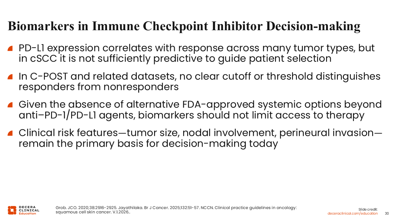 In many solid tumors, PD-L1 expression is used as a predictive biomarker for PD-1/PD-L1 blockade. In cSCC, however, the story is more nuanced. Although PD-L1 expression is common and may correlate with aggressive features, analyses from advanced-disease trials and from C-POST show that patients with both PD-L1–high and PD-L1–low or –negative tumors can derive significant benefit from PD-1 blockade.4-6 No validated PD-L1 cutoff exists to guide adjuvant cemiplimab selection in cSCC. As a result, PD-L1 status should not be used to deny patients adjuvant cemiplimab or advanced-stage PD-1 therapy when otherwise clinically appropriate.2 In current practice, clinical risk features—including tumor diameter, depth of invasion, large-nerve perineural invasion, and nodal involvement—remain the primary determinants of decision-making for adjuvant intervention.2,6