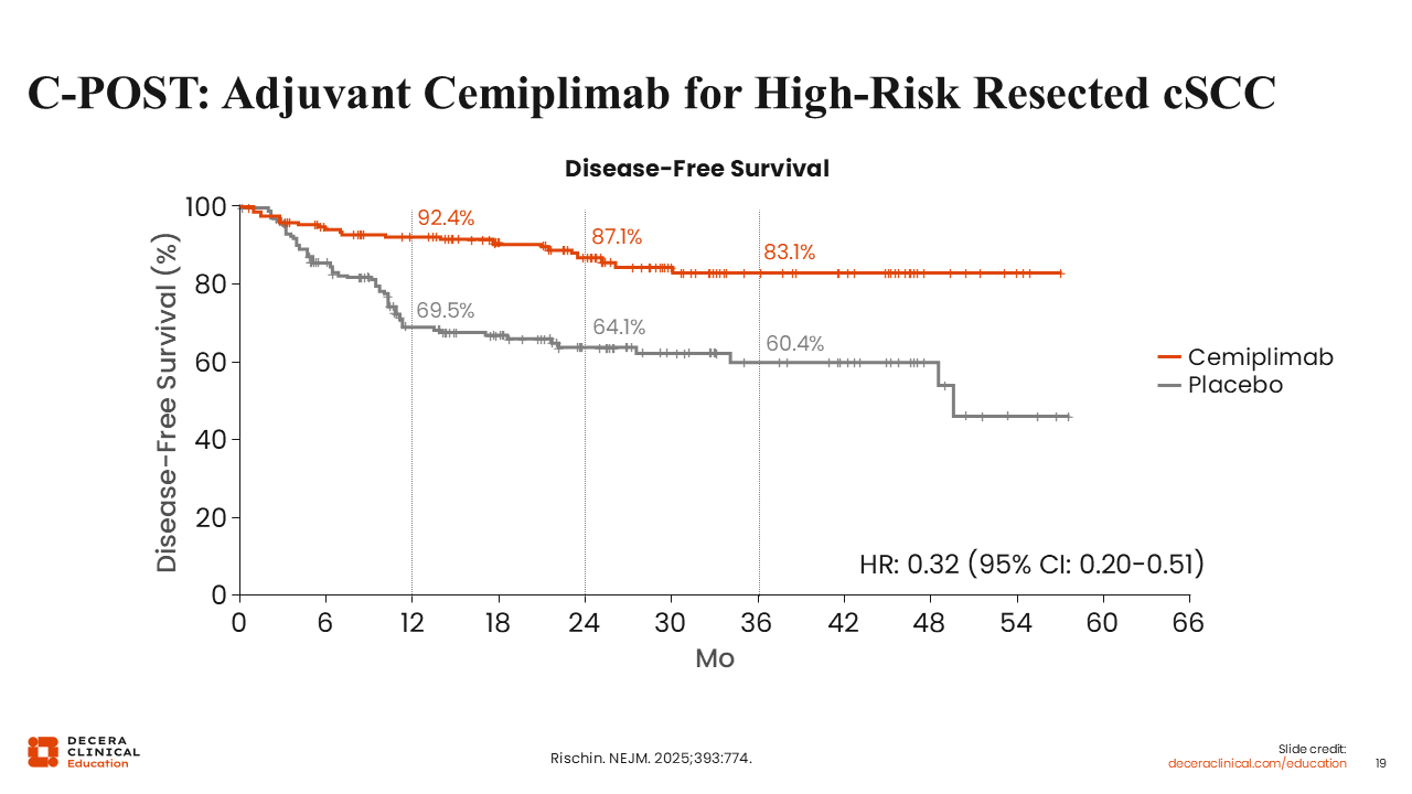 C-POST met its primary endpoint, demonstrating a substantial improvement in DFS with adjuvant cemiplimab in patients with high-risk cSCC. At a median follow-up of 24 months, cemiplimab-treated patients exhibited a markedly lower risk of recurrence or death compared to those receiving placebo, with a hazard ratio of 0.32 (95% CI: 0.20-0.51), corresponding to an approximately 68% risk reduction.6 The estimated 24-month DFS rate was 87.1% for the cemiplimab group vs 64.1% for the placebo group, representing a clinically significant difference of 23 percentage points. Furthermore, the therapeutic benefit remained consistent across all prespecified high-risk subgroups—including both nodal and non-nodal features—and did not appear to depend on PD-L1 expression. These data support the use of adjuvant cemiplimab as a potential new standard of care in appropriately selected patients regardless of PD-L1 status.6,23,24