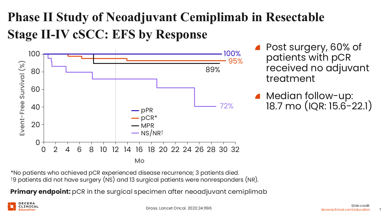 Phase II Study of Neoadjuvant Cemiplimab in Resectable Stage II-IV cSCC: EFS by Response