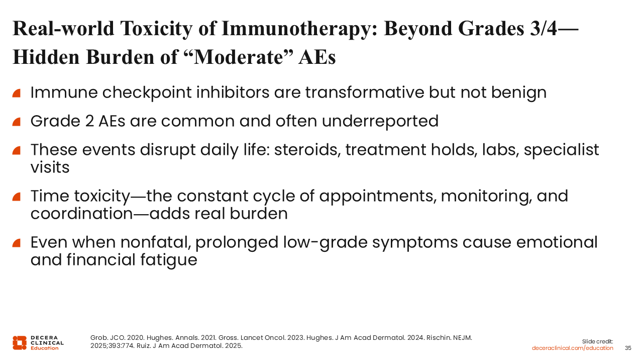 From the patient’s perspective, chronic low- to moderate-grade irAEs can be as impactful as occasional high-grade toxicities. In the KEYNOTE-629 trial, approximately 70% of patients receiving pembrolizumab experienced treatment-related AEs, with 11% to 12% developing grade 3-5 events. However, even persistent grade 1-2 symptoms such as fatigue, pruritus, or diarrhea were sufficient to disrupt daily functioning in older or frail individuals.38 Real-world studies of cemiplimab similarly report that a notable proportion of patients discontinue or interrupt therapy due to cumulative toxicity, despite comparatively low rates of severe (grade ≥3) events.15,37