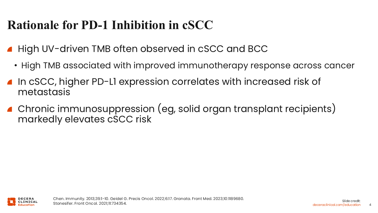 cSCC is characterized by very high tumor mutational burden due to chronic ultraviolet damage, creating abundant neoantigens that can be recognized by T-cells.1 Many cSCCs express PD-L1, and higher PD-L1 expression has been associated with more aggressive tumor behavior.3 Immunosuppression, such as that seen in solid organ transplant recipients, dramatically increases the incidence and aggressiveness of cSCC, highlighting the importance of intact immune surveillance.1 These features collectively provide biologic rationale for targeting the PD-1/PD-L1 pathway in cSCC and help explain the robust and durable responses observed with PD-1 inhibitors in advanced disease.4,5