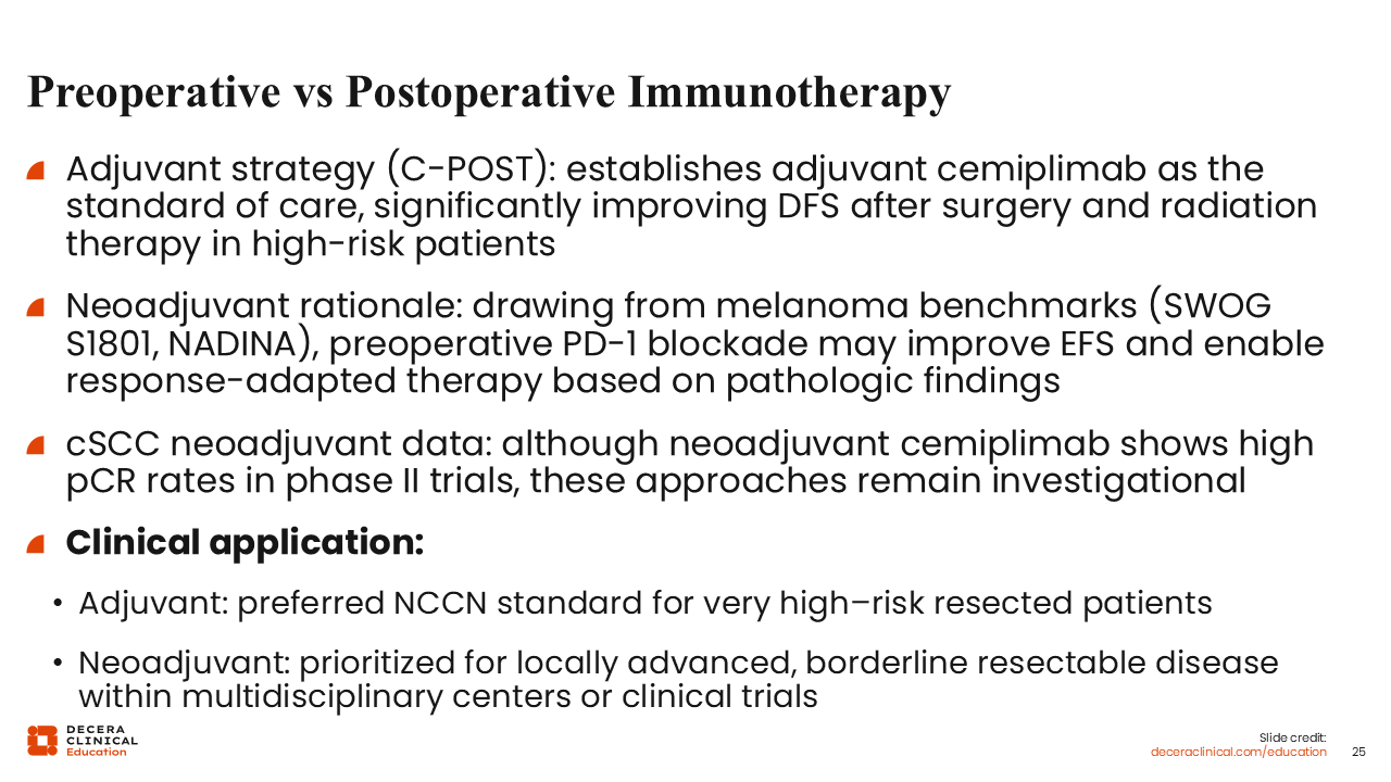 A natural question emerging from the evolving data is whether preoperative (neoadjuvant) or postoperative (adjuvant) immunotherapy is the superior strategy. For now, there is no single correct answer, but the roles for each are becoming clearly defined. The C-POST trial demonstrated that adjuvant cemiplimab significantly improves DFS in high-risk resected cSCC following surgery and RT.6