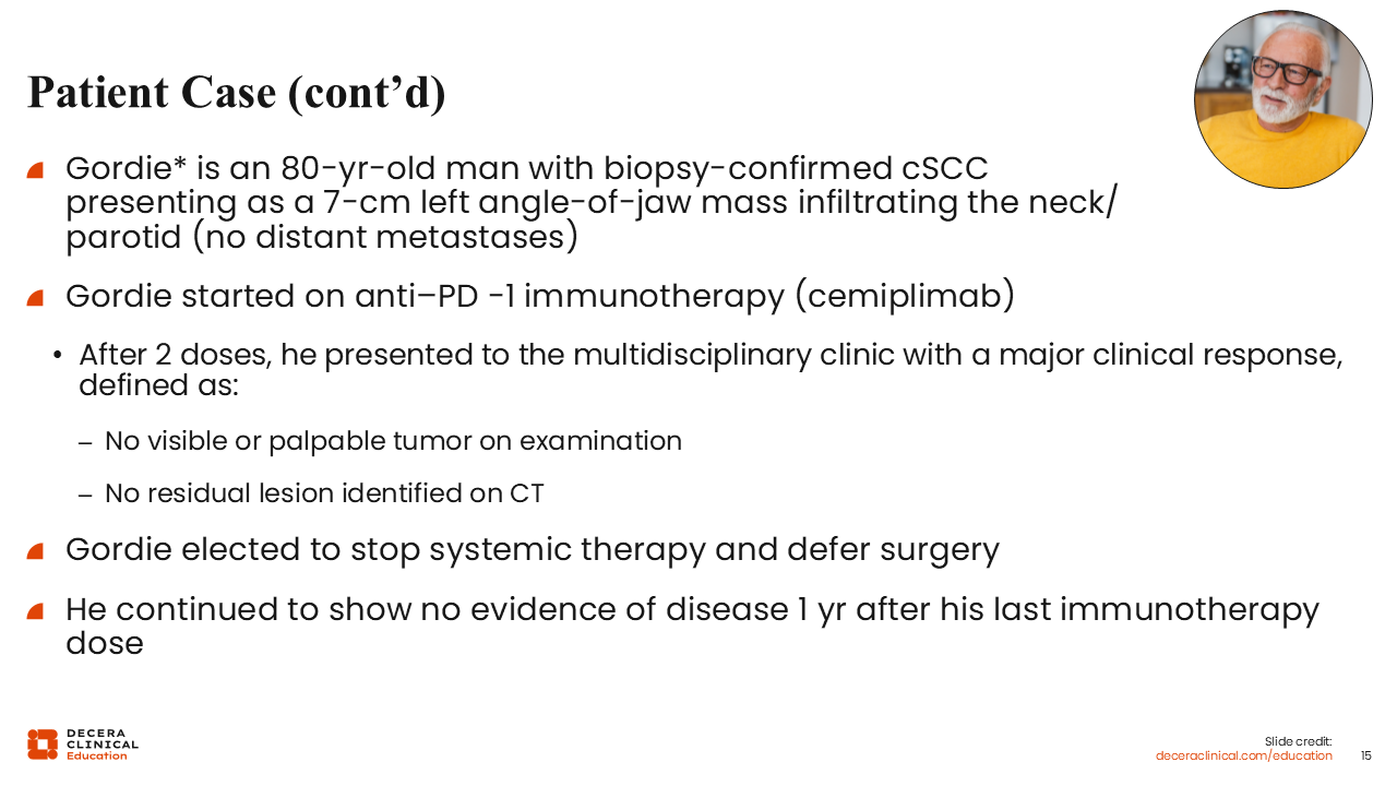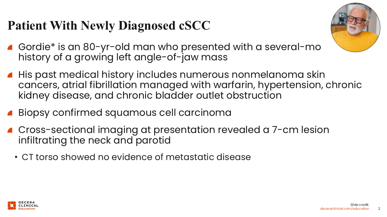 Gordie is an 80-year-old man who presents with a large scalp lesion that has progressively enlarged. Biopsy confirms cSCC. Cross-sectional imaging reveals a deeply invasive primary lesion with suspected involvement of the calvarium and enlarged cervical lymph nodes, features typical of very high–risk head and neck cSCC. His past medical history is notable for hypertension and mild chronic kidney disease, and he lives independently with limited family support.