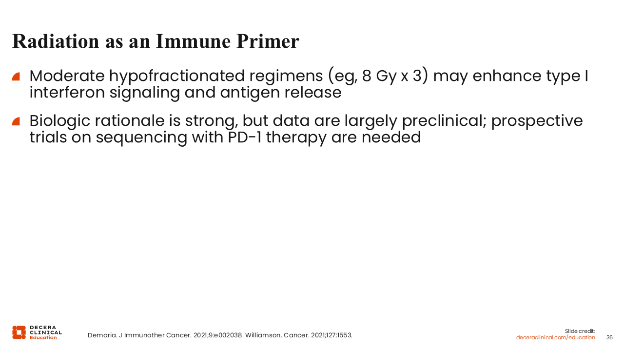 RT functions not only as a local cytotoxic modality but also as a potential immune sensitizer that may augment the activity of PD-1 blockade. Preclinical and translational studies suggest that moderately hypofractionated regimens, such as 8 Gy × 3 fractions, can induce immunogenic cell death, activate type I interferon signaling, and enhance tumor antigen presentation, thereby increasing tumor susceptibility to immune-mediated clearance.39 In several experimental models, combining hypofractionated RT with PD-1 inhibition has been associated with increased CD8⁺ T-cell infiltration and, in some cases, abscopal responses, where nonirradiated lesions also regress.39