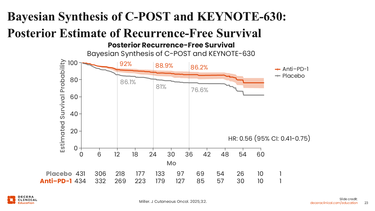 From a Bayesian perspective, the totality of data suggests that adjuvant PD-1 blockade improves outcomes in appropriately selected patients with high-risk cSCC, though the strength of evidence is not uniform across agents. The C-POST trial demonstrated a robust 68% relative reduction in recurrence or death with cemiplimab (HR: 0.32; 95% CI: 0.20-0.51), whereas KEYNOTE-630 was stopped early for futility, as pembrolizumab failed to show a significant DFS benefit.6,24 A Bayesian synthesis incorporating prior evidence from metastatic cSCC supports a high posterior probability that the cemiplimab results reflect a true treatment effect, rather than a class-wide certainty for all PD-1 inhibitors.27