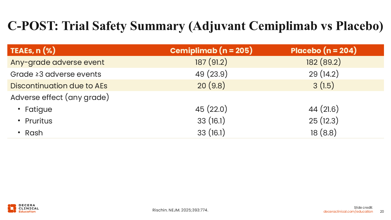 The overall treatment-emergent adverse event (TEAE) burden in C-POST was similar between arms: 91.2% with cemiplimab vs 89.2% with placebo, consistent with an older, comorbidity-heavy population. However, higher-grade toxicity was more frequent with cemiplimab, with grade 3-5 TEAEs in 23.9% vs 14.2%. Treatment discontinuation due to TEAEs occurred more often with cemiplimab (9.8%) vs placebo (1.5%), aligning with the expected tolerability tradeoff of adjuvant PD-1 blockade.6