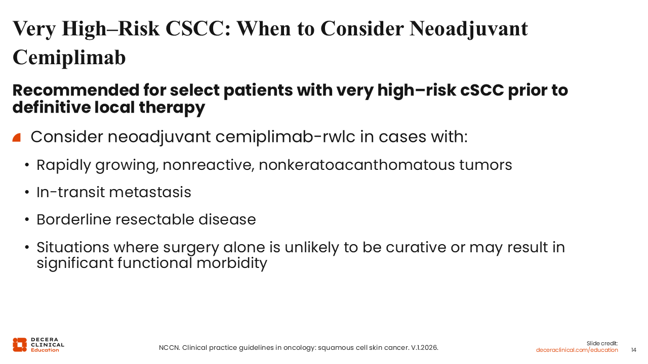 The NCCN guidelines now state that neoadjuvant cemiplimab may be considered for select patients with very high–risk cSCC following a multidisciplinary review.2 This recommendation is specifically tailored for patients with rapidly growing tumors, in-transit metastases, borderline resectable disease, or cases where surgical resection alone is unlikely to be curative or would result in substantial functional impairment.