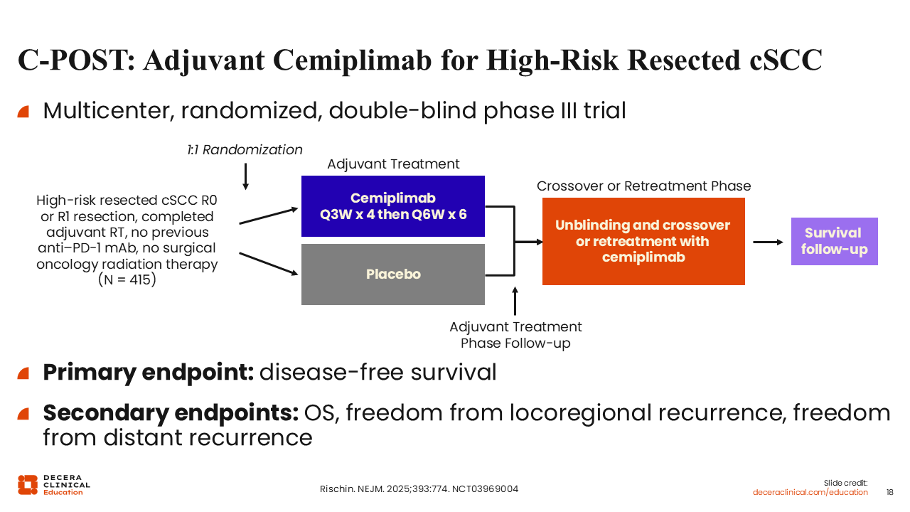 The phase III C-POST trial evaluated adjuvant cemiplimab vs placebo in patients with resected high-risk cSCC who had completed postoperative RT. Eligible patients had either high-risk nodal disease, including multiple positive lymph nodes or ENE or high-risk non-nodal features, such as deeply invasive primary tumors, perineural invasion, or high-risk histologic features. Treatment consisted of cemiplimab administered every 3 weeks during the induction phase followed by every 6 weeks during maintenance for a total planned duration of approximately 1 year, compared with matched placebo. The primary endpoint was disease-free survival (DFS), and secondary endpoints included OS and patterns of locoregional and distant recurrence.6