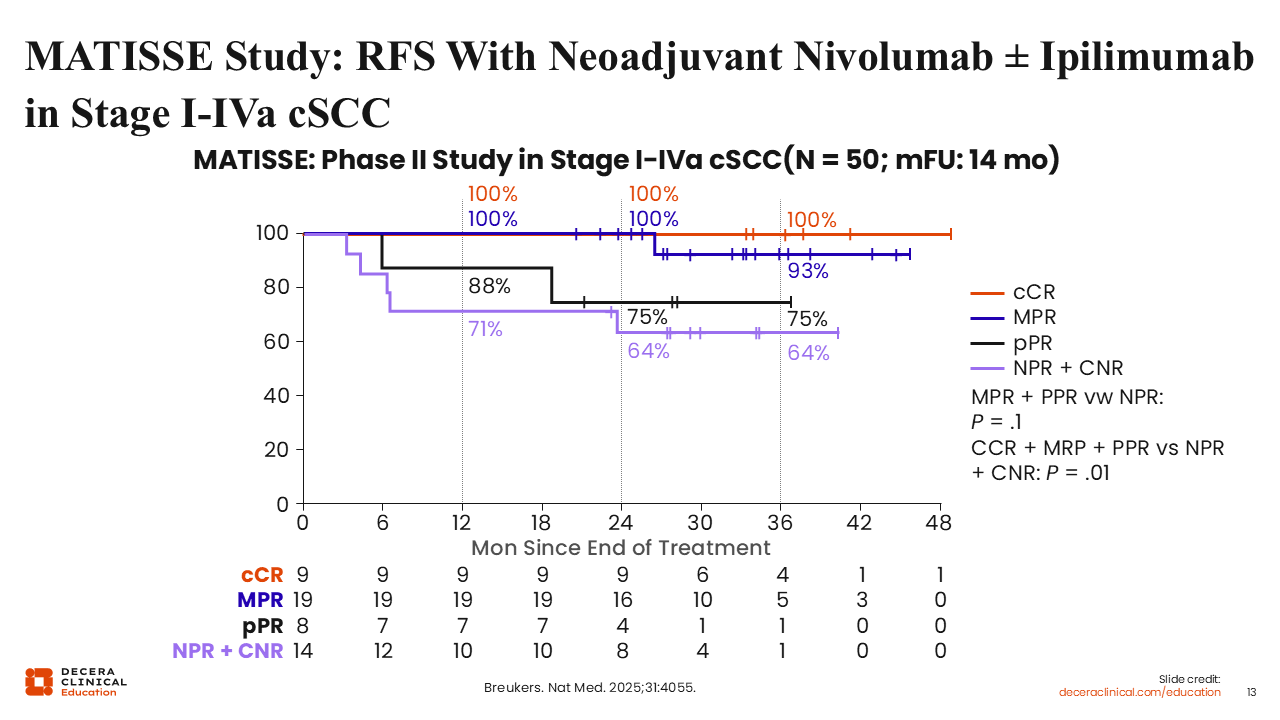 In the MATISSE trial, RFS strongly correlated with the depth of response following just 2 doses of neoadjuvant nivolumab with or without ipilimumab. Outcomes were analyzed across 4 response categories: clinical complete response (cCR), major pathologic response (MPR), pathologic partial response (pPR), and no response (no pathologic response [NPR] plus clinical non-response [CNR]).