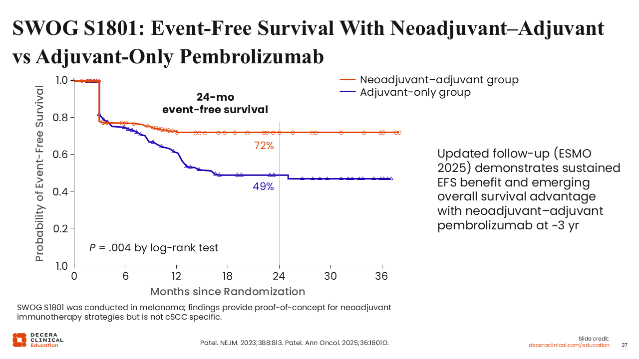 Experience in melanoma helps frame why neoadjuvant immunotherapy is attractive for high-risk cSCC, even though the diseases are biologically distinct. In the SWOG S1801 trial, patients with resectable stage IIIB-IV melanoma were randomized to either 3 cycles of neoadjuvant pembrolizumab followed by surgery and 15 additional adjuvant cycles, or upfront surgery followed by adjuvant pembrolizumab alone. Of importance, both arms were planned to receive the same total number of doses of pembrolizumab; the only variable was the timing of treatment initiation.28