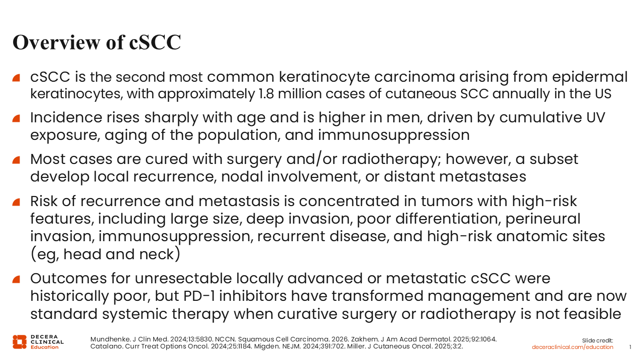 cSCC is the second most common skin cancer and a leading cause of mortality among keratinocyte carcinomas.1 Although the majority of tumors are small, well-differentiated, and effectively managed with standard surgical excision or Mohs micrographic surgery, a clinically significant subset of patients presents with high-risk or advanced disease.1,2