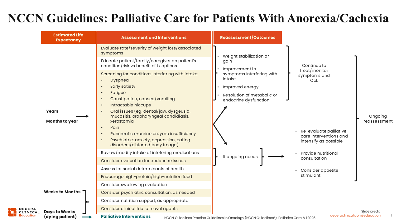 Based on the estimated life expectancy for the individual patient, the NCCN guidelines for palliative care recommend evaluations for weight loss, screening for conditions that interfere with food intake, and a review/modification of medications that may interfere with food consumption. Patient, family member, and caregiver education on the patient’s condition and needs, particularly related to the risk vs benefit of treatment options, is also emphasized in the NCCN guidelines.