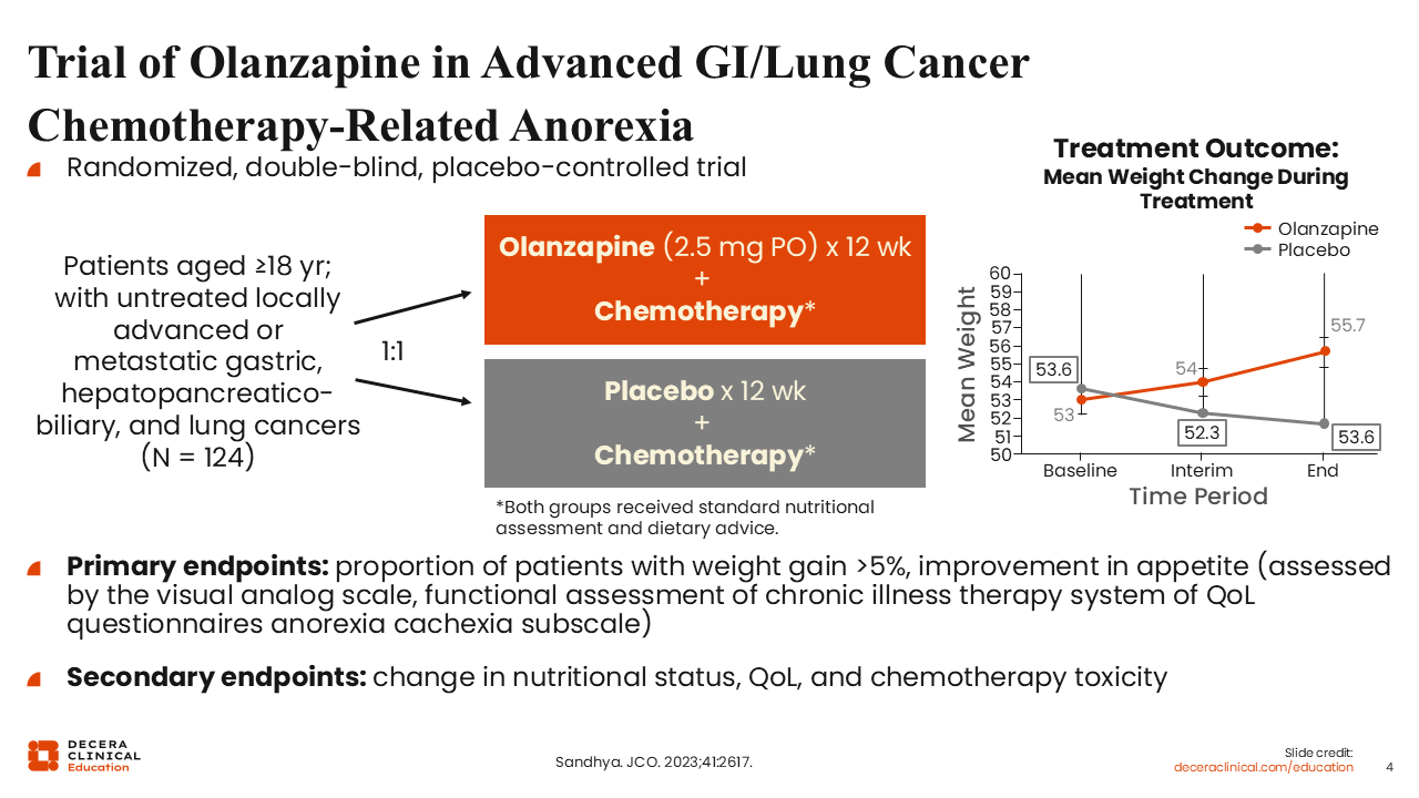 A randomized, double-blind, placebo-controlled trial conducted in India investigated chemotherapy with or without low-dose olanzapine (2.5 mg PO for 12 weeks) for 124 adult patients with untreated locally advanced or metastatic gastric, hepatopancreaticobiliary, and lung cancers.7 The primary endpoints were the proportion of patients with weight gain >5% and improvement in appetite.
