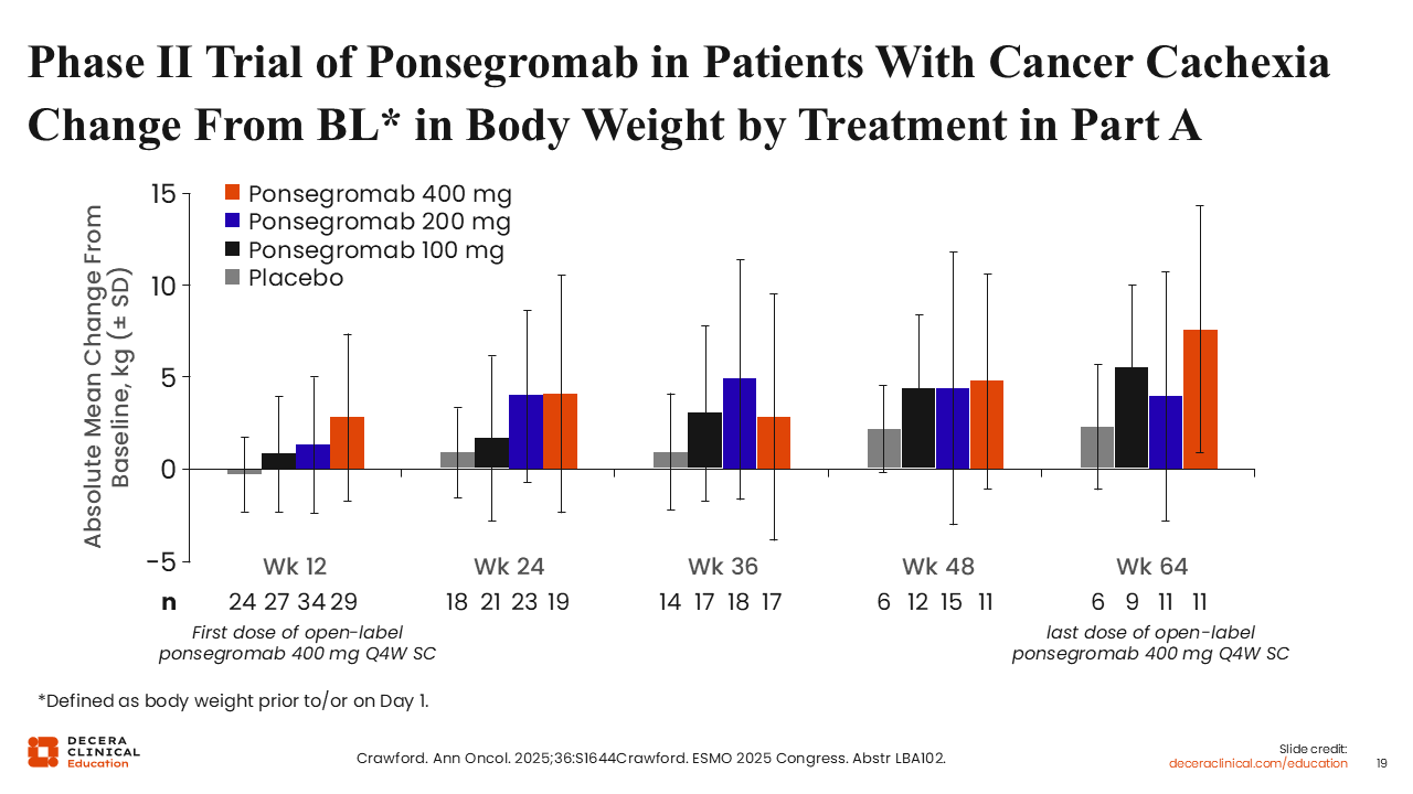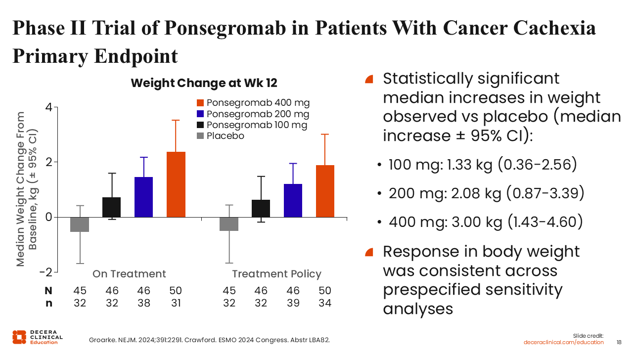 As expected, treatment with ponsegromab led to an increase in weight gain, and overall increase in functional activity with a reduction in symptoms of cachexia.18 Body weight was consistent across ponsegromab dose levels, with the largest increase in weight gain observed at the 400-mg dose level.