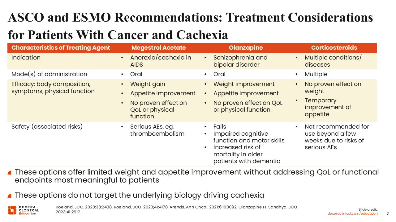 Besides ASCO, the European Society for Medical Oncology (ESMO) is another professional body with guidelines for cancer cachexia. Both ESMO and ASCO have considered megestrol acetate (a synthetic progestin), olanzapine, and corticosteroids for use as appetite stimulants.3,4,6 However, it is very important to note that none of these agents is directly indicated for the treatment of cancer cachexia. Although in some cases these agents may exert limited but positive effects on weight gain and improvements in appetite, they are also associated with safety concerns that HCPs need to be aware of. In essence, none of these 3 agents really address the underlying biology of cachexia in patients with advanced cancer. So, there is substantial room for improvement in finding agents that directly treat cachexia.