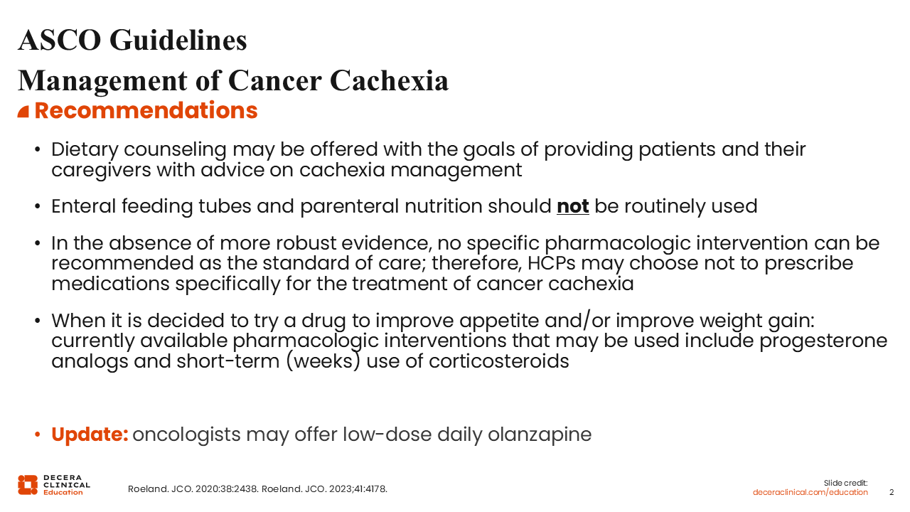 The ASCO guidelines note that enteral feeding tubes and parenteral nutrition should not be routinely used in the management of patients with cancer cachexia. Per the ASCO guidelines, no specific pharmacologic intervention can be recommended as the standard of care in the absence of more robust evidence.