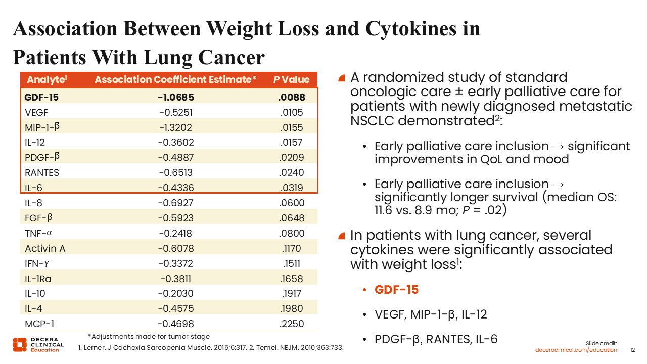 In a study of patients with lung cancer, multiple cytokines were found to correlate with weight loss, including GDF-15, vascular endothelial growth factor, and several interleukins. Of these inflammatory cytokines, GDF-15 was identified as the only predictor of weight loss.28