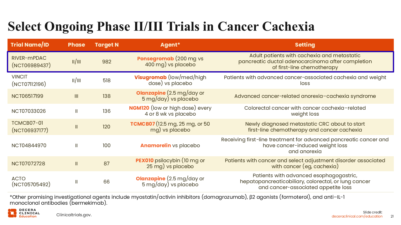 Based on these promising results, the randomized, double-blind, multicenter phase II/III RIVER-mPDAC trial is investigating the efficacy, safety, and tolerability of standard chemotherapy plus ponsegromab vs standard chemotherapy alone for adult patients with newly diagnosed metastatic pancreatic ductal adenocarcinoma and cachexia (NCT06989437).