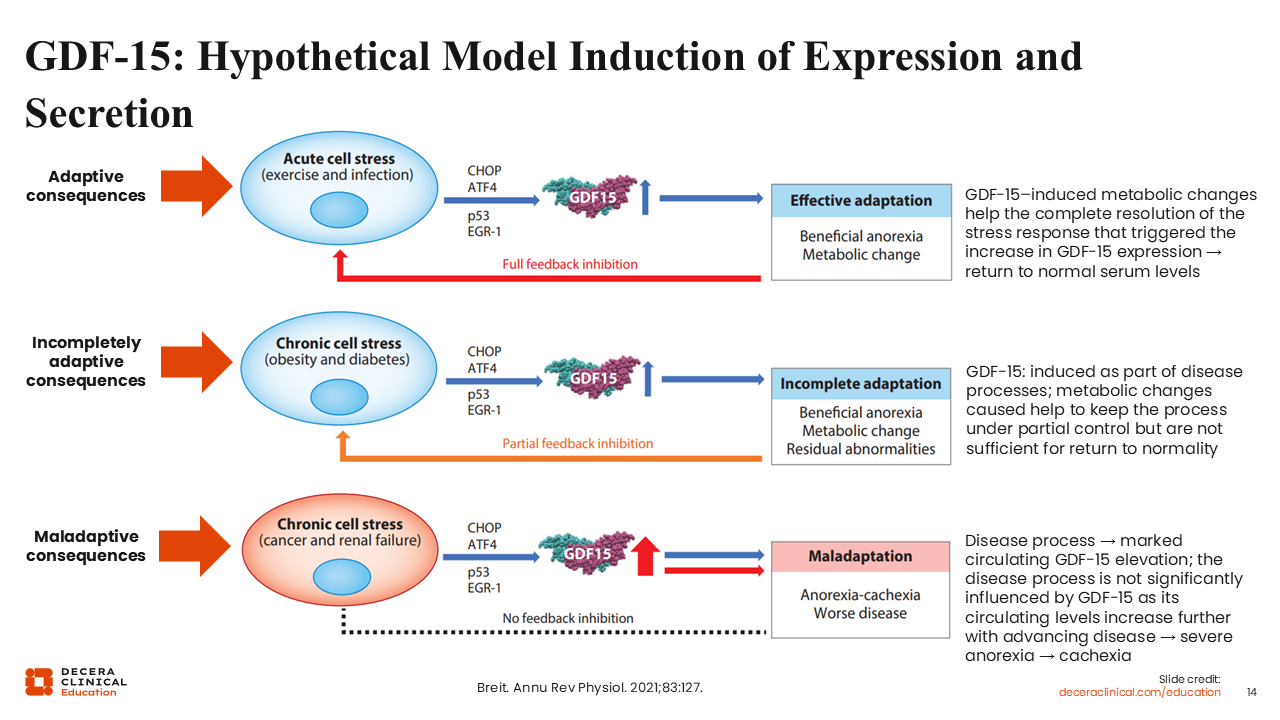 It is important to note that the biologic effects of GDF-15 vary depending on the context and duration of the stress response.32 In acute cell stress conditions such as infection or exercise, transient increases in GDF-15 levels may produce adaptive metabolic responses. These responses can include temporary appetite suppression and metabolic adjustments that help the body to respond to short-term physiologic stress. Once the stress is eliminated, circulating GDF-15 levels typically return to normal serum levels.