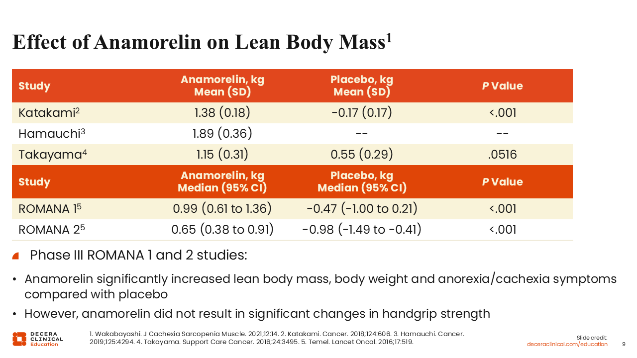 Several trials have investigated the effect of anamorelin on lean body mass in patients with cancer and cachexia.20-24 Of particular interest are the randomized phase III ROMANA 1 and ROMANA 2 trials, which investigated anamorelin vs placebo for patients with advanced NSCLC and cachexia.23 The coprimary efficacy endpoints were the median change in lean body mass and handgrip strength over 12 weeks measured in all study participants (intention-to-treat population).