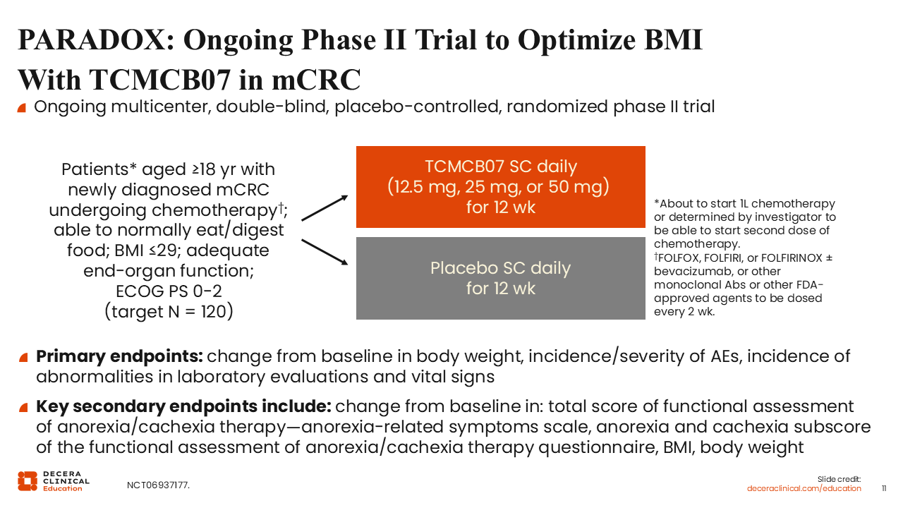 Therefore, PARADOX is an ongoing randomized phase II trial that is investigating TCMCB07 vs placebo for patients with newly diagnosed metastatic CRC receiving chemotherapy (NCT06937177). This proof-of-concept trial will investigate 3 different daily doses of TCMCB07 (12.5 mg, 25 mg, or 50 mg) vs placebo for 12 weeks. The primary endpoints are change from baseline in body weight, incidence/severity of adverse events, and incidence of abnormalities in laboratory evaluations and vital signs. The secondary endpoints include functional assessments of anorexia/cachexia and body mass index.