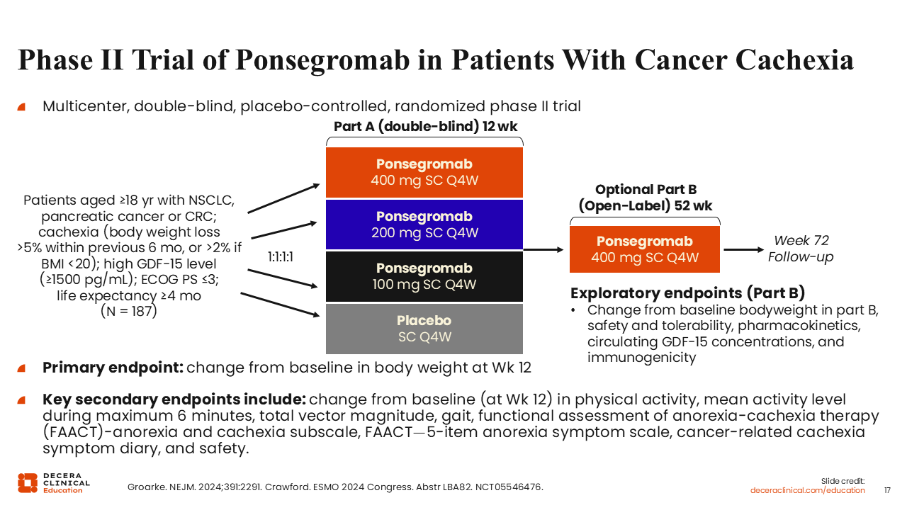 The encouraging results from the small first-in-human phase Ib trial led to the conduct of a multicenter, multipart, double-blind, placebo-controlled, randomized phase II trial (NCT05546476). Patients 18 years of age or older with NSCLC, pancreatic cancer, or CRC and cachexia were eligible to participate if they had body weight loss >5% within the previous 6 months, or body weight loss >2% and a body mass index <20 kg/m2. All patients had a high GDF-15 level (≥1500 pg/mL) and a life expectancy ≥4 months.