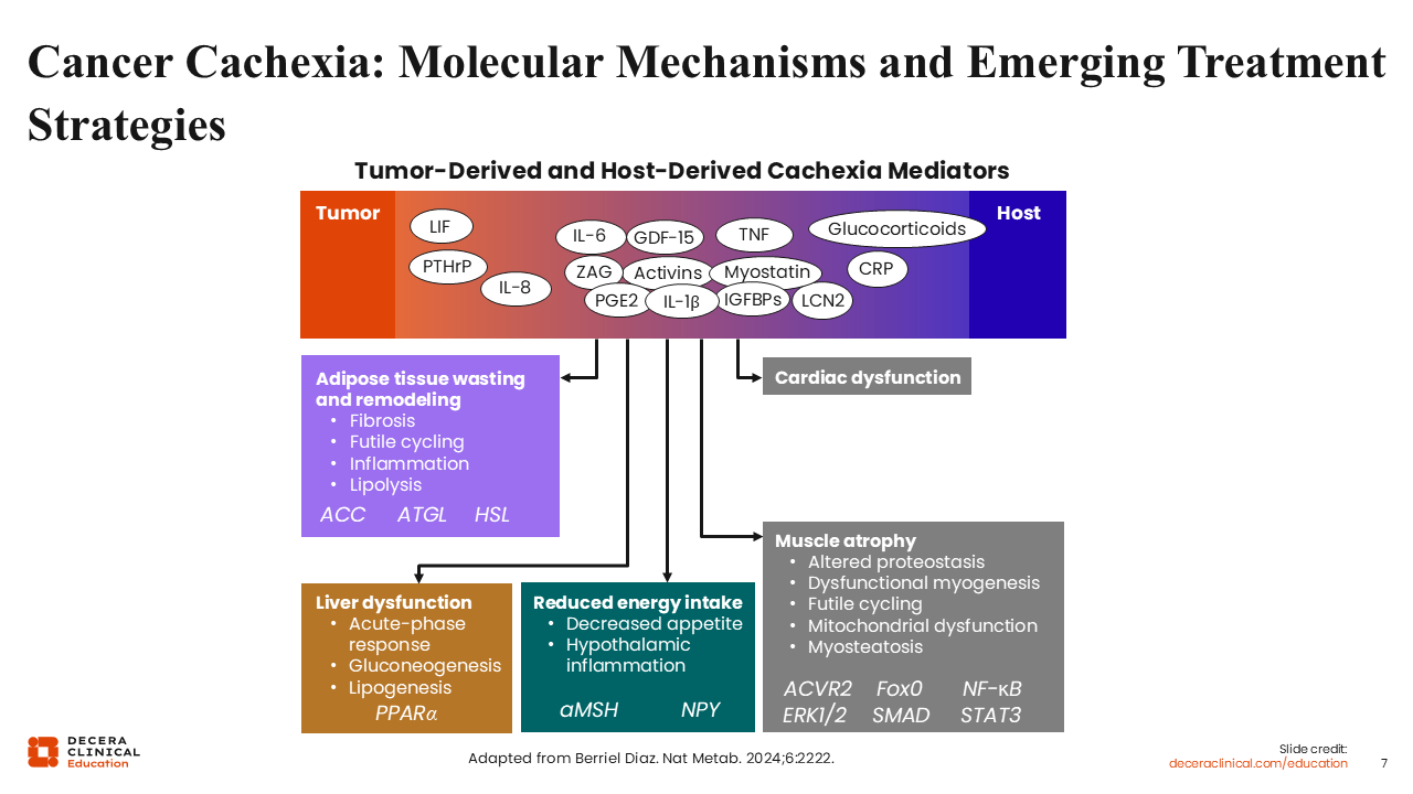 Cancer cachexia is increasingly recognized as a complex, multiorgan syndrome involving interactions among tumor-derived signals, host inflammatory responses, and multiple metabolic pathways.1 This syndrome remains a major unmet medical need in the management of patients with cancer.