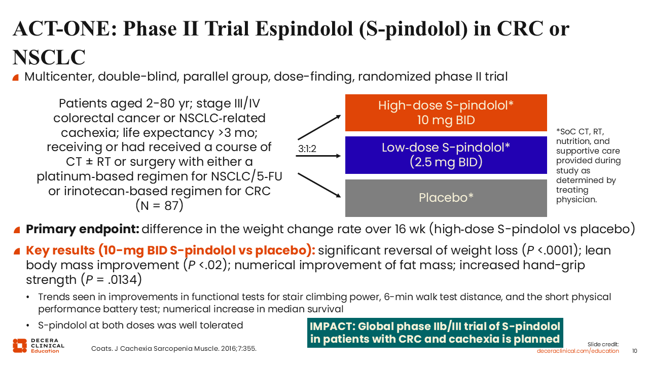 ACT-ONE is a randomized phase II trial that compared the effects of low-dose or high-dose S-pindolol vs placebo for 87 patients with cachexia and advanced-stage colorectal cancer (CRC) or NSCLC who have a life expectancy >3 months.25 All patients were receiving or had received chemotherapy-based therapy for advanced cancer. The primary endpoint was weight change rate over 16 weeks.