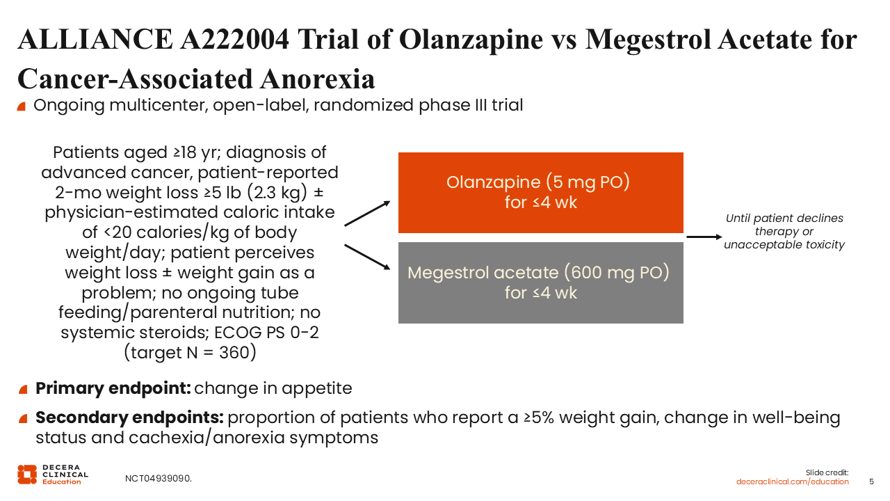 Of interest is the ongoing multicenter, randomized phase III ALLIANCE A222004 trial that is investigating olanzapine (5 mg PO for ≤4 weeks) vs megestrol acetate (600 mg PO for ≤4 weeks) for adult patients with a diagnosis of advanced cancer and anorexia (NCT04939090). It is anticipated that 360 patients will be enrolled on this trial. The primary endpoint of this head-to-head comparison between olanzapine and megestrol acetate is change in appetite. The secondary endpoints include the proportion of patients with a ≥5% weight gain, and a change in well-being status and cachexia/anorexia symptoms.