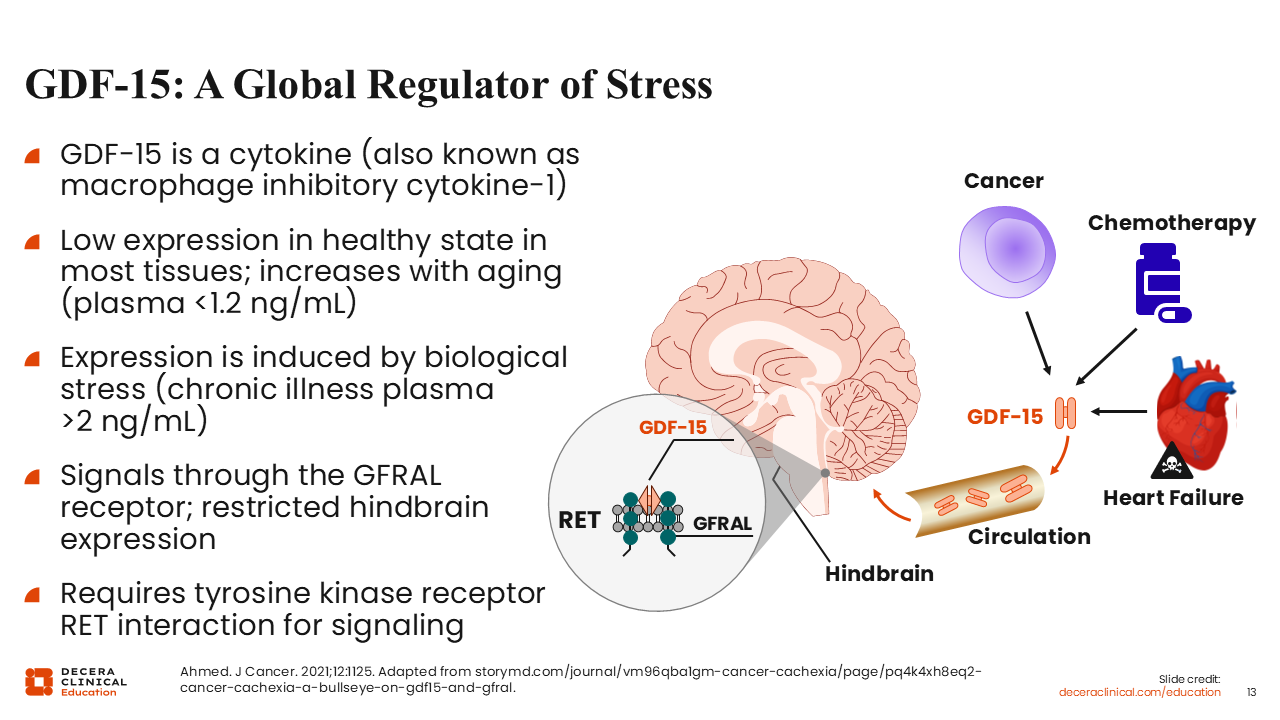 To reiterate, among several inflammatory cytokines associated with cancer cachexia, GDF-15 has emerged as an important regulator of stress response. It is a novel inflammatory cytokine that is detected at significantly higher concentrations in the plasma of patients with cancer compared with those without a cancer diagnosis.28,31 Its expression is triggered by biologic stress.