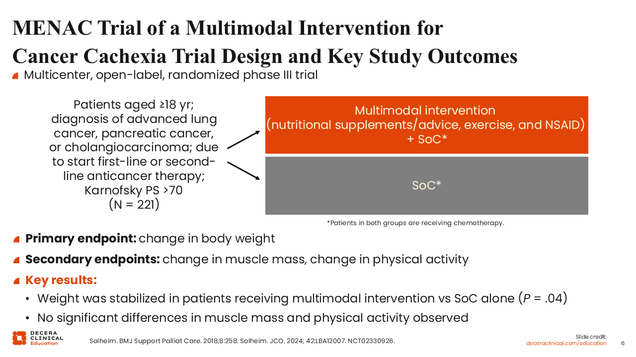 MENAC Trial of a Multimodal Intervention for Cancer Cachexia Trial Design and Key Study Outcomes