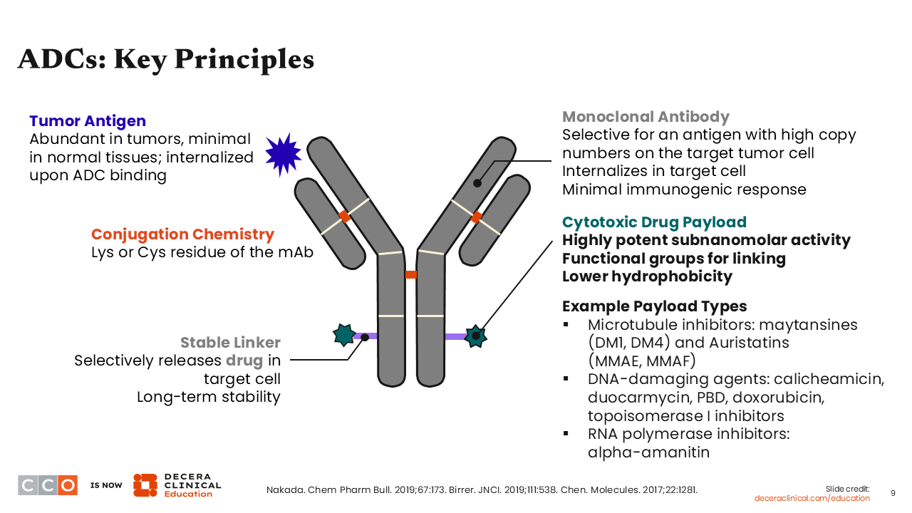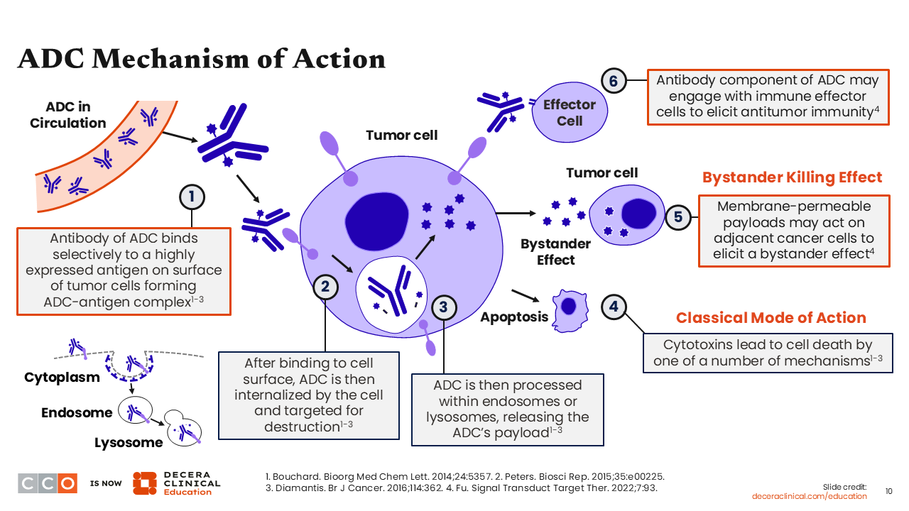 To reiterate, the conjugation chemistry for ADCs includes a monoclonal antibody that selectively binds to a specific and highly expressed target on the surface of the malignant tumor cell. Once it gets internalized into the cell, it releases its cytotoxic payload that, in turn, triggers tumor cell death.29-31 For some ADCs, the cytotoxic payload also is able to penetrate the cell membrane, and so, it has the ability to act on adjacent cancer cells to elicit a bystander effect, thereby killing the adjacent cancer cell.32 T-DXd is an ADC with bystander effects, so even if a neighboring tumor cell does not robustly express HER2, T-DXd has the ability to trigger cell death via this bystander effect. By contrast, the payload for T-DM1 does not have this capability.