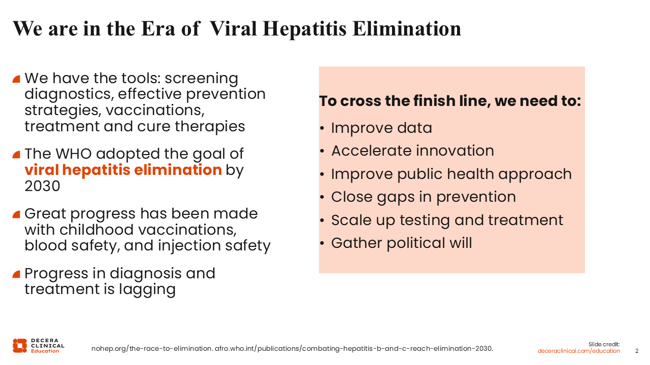 Because we have these tools, in 2016, the World Health Organization (WHO) adopted the goal of viral hepatitis elimination by 2030, which is just around the corner. In the race towards this goal, great progress has been made with childhood vaccinations, blood safety, and injection safety. However, progress in diagnosis and treatment is lagging behind.5