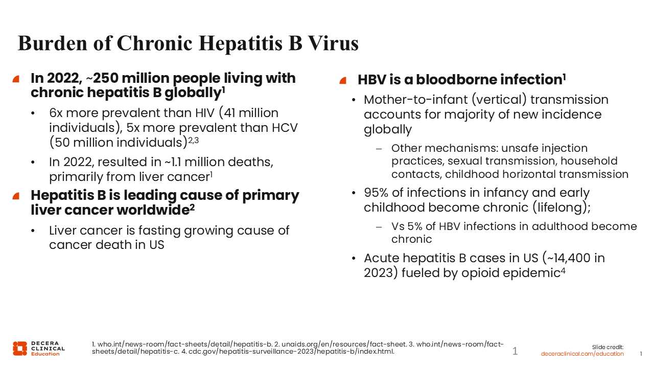 Chronic HBV infections are the most common chronic infectious disease in the world. It is 6 times more prevalent than HIV and 5 times more prevalent than hepatitis C.1-4 In 2022, HBV resulted in 1.1 million deaths, primarily from liver cancer, which comes out to approximately 1 HBV-associated death every 30 seconds.1