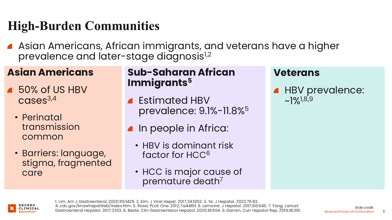 In the United States, certain key communities bear the brunt of the hepatitis B burden. Asian Americans, immigrants from Africa, and veterans have very high rates of hepatitis B and are often diagnosed at a later stage.8,9
