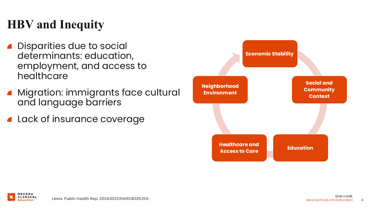 These disparities can result from social determinants of health, such as education, employment, and access to healthcare. Hepatitis B, specifically, affects many people who are immigrants or migrants. These populations often face significant financial, cultural, and lingual barriers to healthcare access in the countries that they've moved to.7