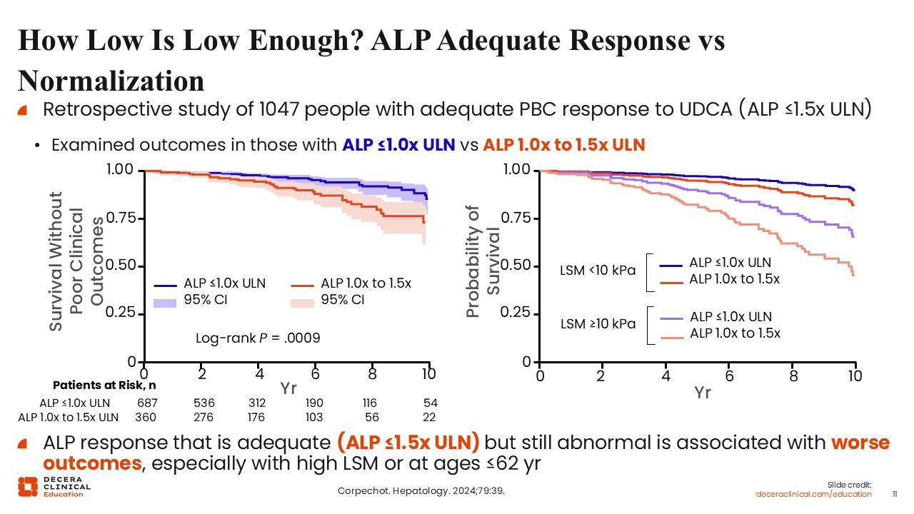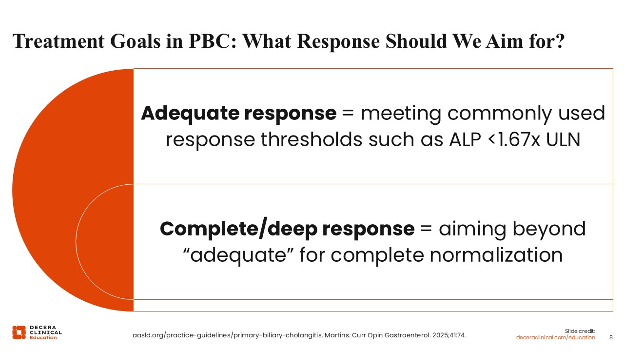 So, what response should we aim for? Many phase III studies for second-line PBC therapies define treatment goals similar to the POISE criteria for treatment response: ALP <1.67 times the ULN and total bilirubin ≤1 times the ULN. However, is lower better? That is, ALP <1.67 times the ULN is good, but should we be aiming for complete normalization of ALP and even lower total bilirubin?6