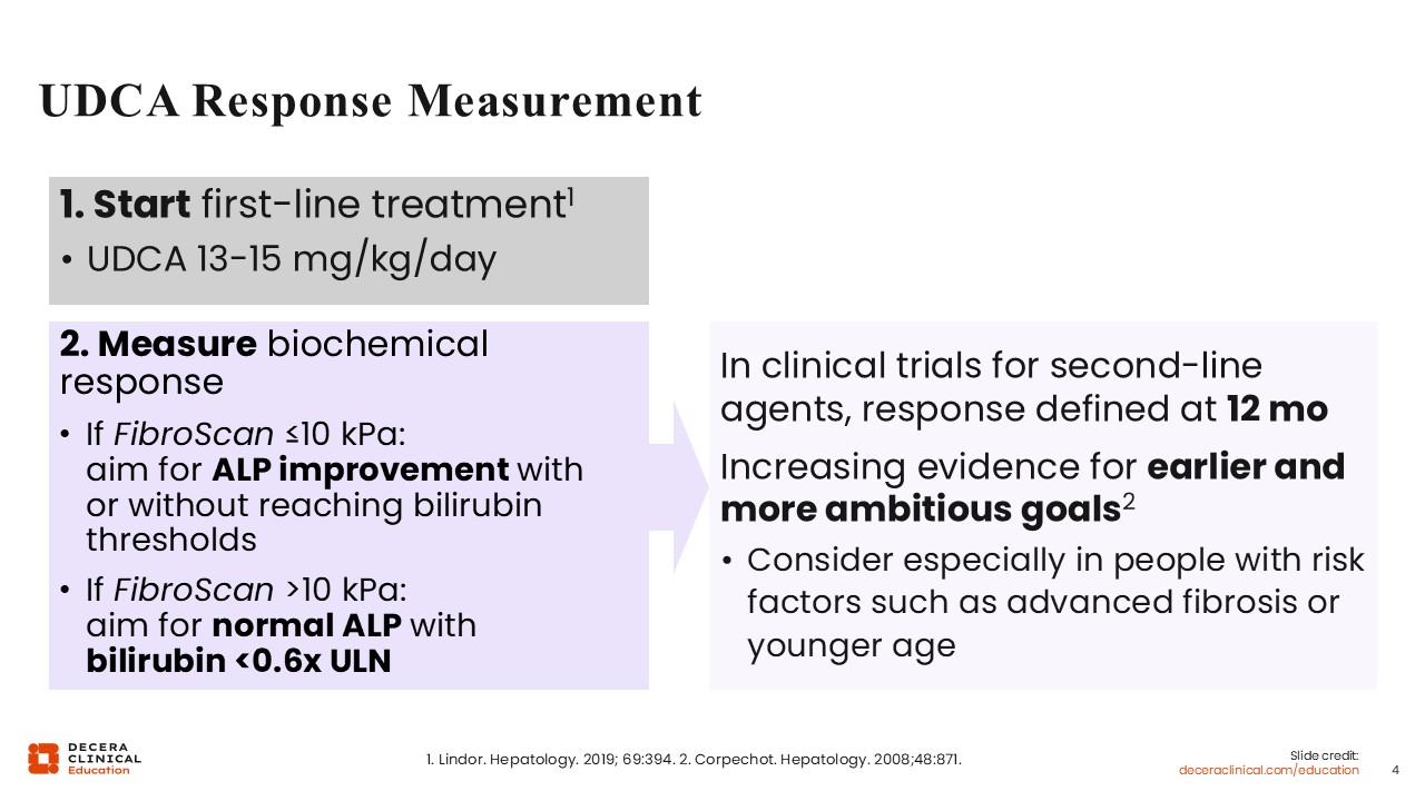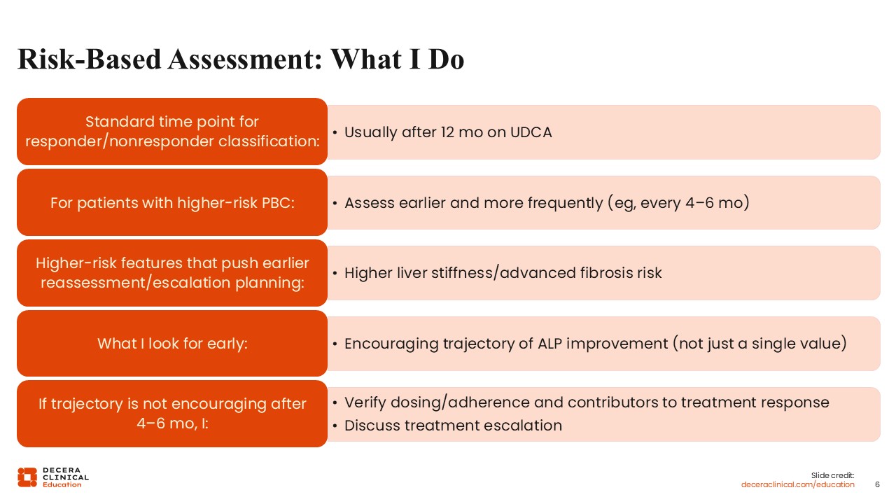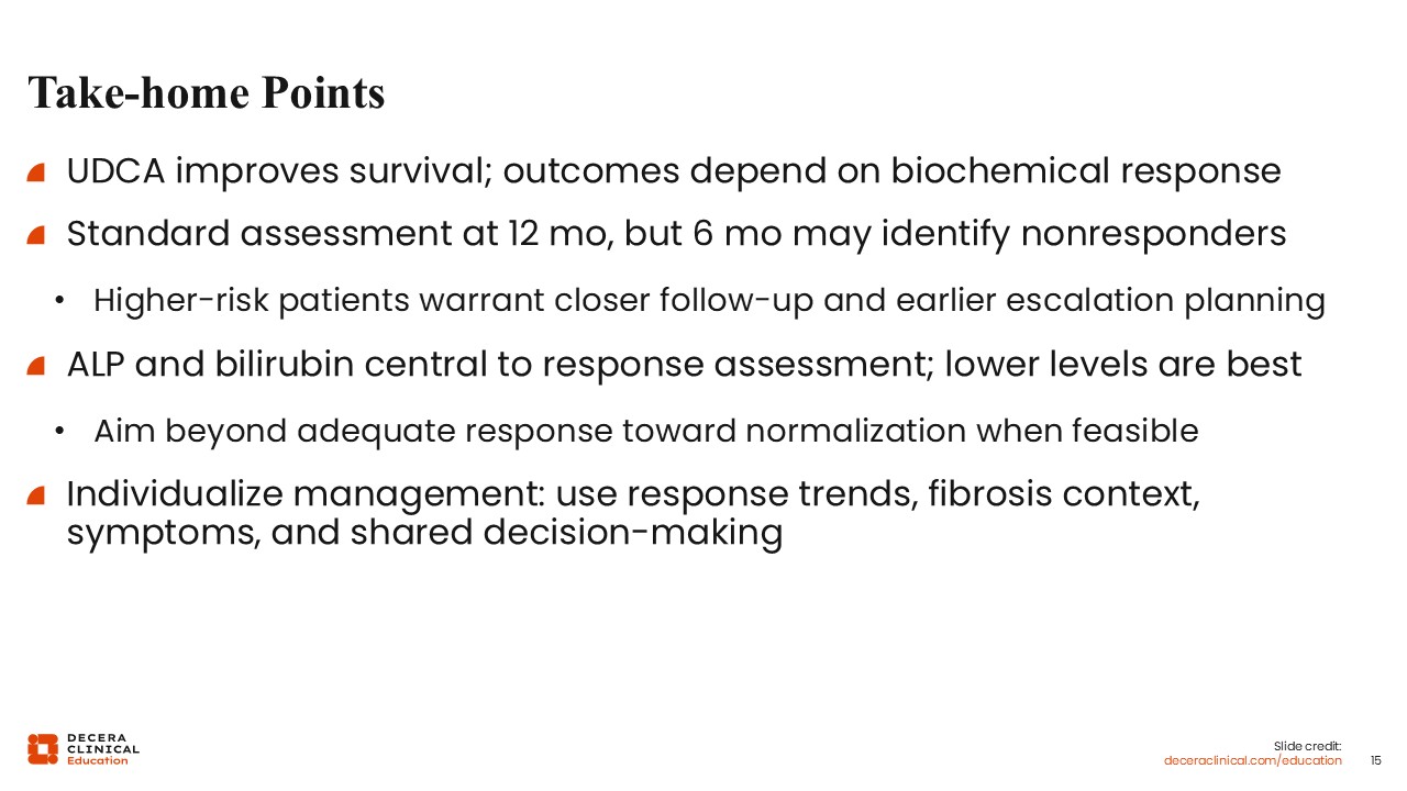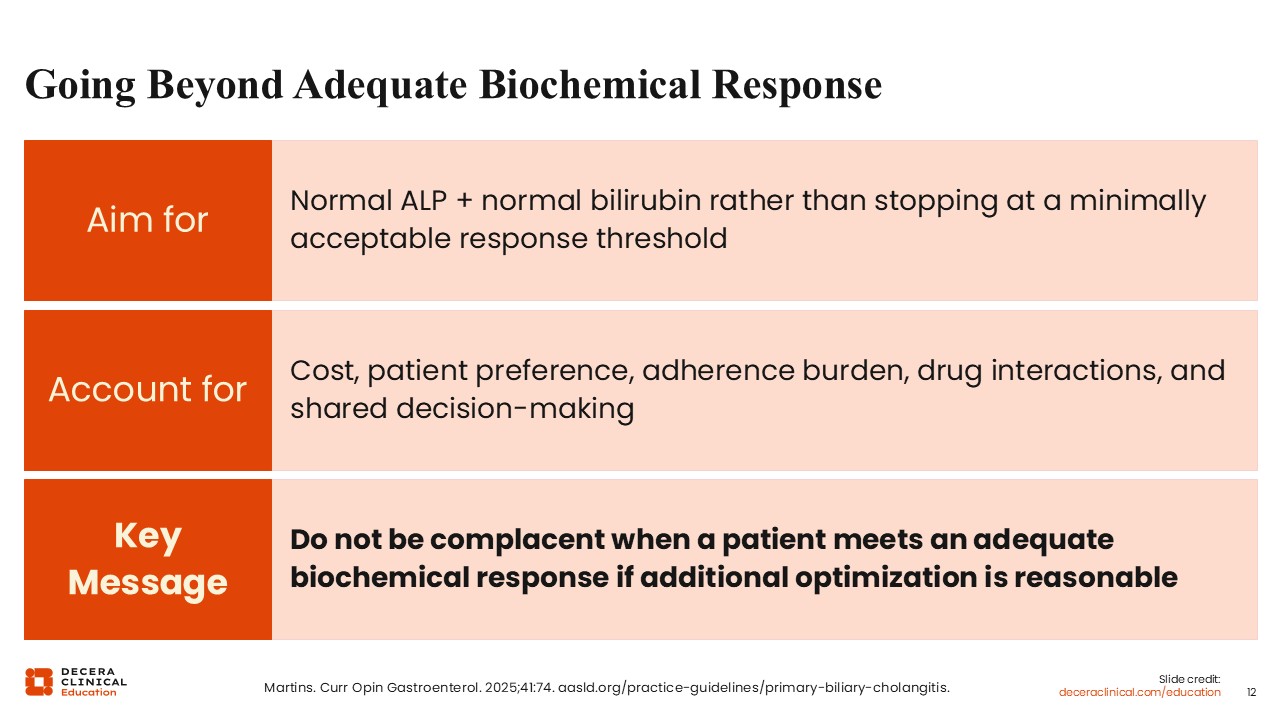 In summary, optimizing care for PBC requires thoughtful, ongoing assessment of biochemical response so that patients who are not on an adequate trajectory can be identified early and considered for treatment escalation when appropriate.