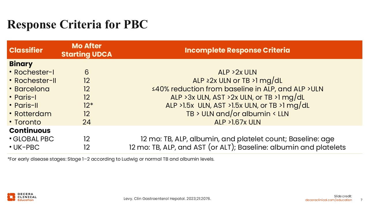 In addition to deciding when to assess the treatment response, choosing which response criteria to use also requires nuance. There are many response criteria for PBC. Most of them assess response at 12 months and assess for improvement in ALP and total bilirubin. Some, like the Paris criteria, also take liver enzymes into consideration.2
